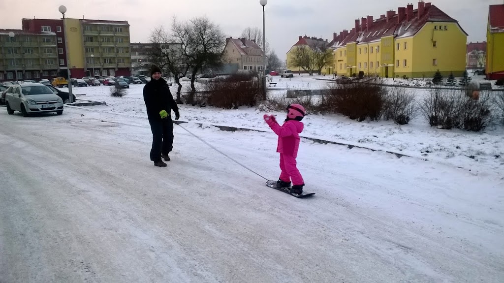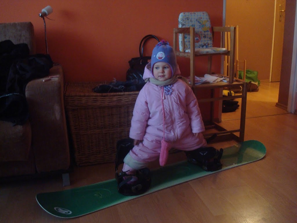 Po przekroczeniu 3-ego roku życia, dostała pod choinkę jej pierwszą w życiu deskę, plastikową ponieważ w zamiarze mieliśmy plan, by zacząć uczyć ją wyczucia równowagi, a zabawkowy snowboard by na tyle lekki do jej wagi ciała, że nie sprawiało jej to większego problemu. Pierwsze próby nauki równowagi odbywały się na dystansie ok. 300 m, codziennie przed 8 rano z domu do przedszkola. Stała na desce twardo w kasku, goglach i kombinezonie, gotowa na komendę taty typu backside lub frontside. Mąż na przyczepionym do deski sznurku ciągnął ją zasapany, pilnując by w obniżonej nisko pozycji rozkładała szeroko ręce, by utrzymać równowagę ciała. Śmieszny to był zapewne widok, ponieważ na nizinach nikt nie przyjeżdżał na desce do przedszkola, ubranym jak ze stoku, gdyż wszyscy surfowali z rodzicami na sankach. Dumnie stała wytrwale naśladując tatę i co chwilę próbując z podskoku zrobić małe nieporadne ollie. Dużo wspomnień kłębi się w głowie, te lodowe zamki i babki śnieżne stawiane z foremek do piasku i miliony różnych innych pomysłów, by można było ją czymkolwiek zająć i zjechać choć ten ostatni jeszcze raz ze stoku. Tak, początki bywały niekiedy trudne i uporczywe. Nie schodząc z tematu, potem doszły wrotki, rolki czy deskorolka. Oboje staraliśmy się wspólnie wymyślać takie sposoby spędzenia czasu i formy zabawy, dążące do zwiększania jej poczucia równowagi, a że dzieci nie nie posiadają zbytnio lęku w sobie, nie było to dla niej większym problemem.